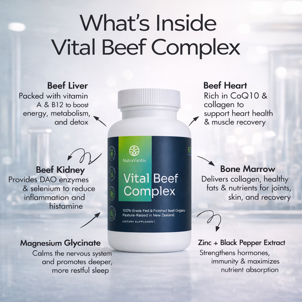 Vital Beef Complex is built on a simple nutritional principle: your body functions best when it receives nutrients in forms it can recognize and use efficiently. While many modern supplements rely on isolated synthetic ingredients, this formula focuses on whole-food, freeze-dried beef organs combined with targeted mineral support and an absorption enhancer.