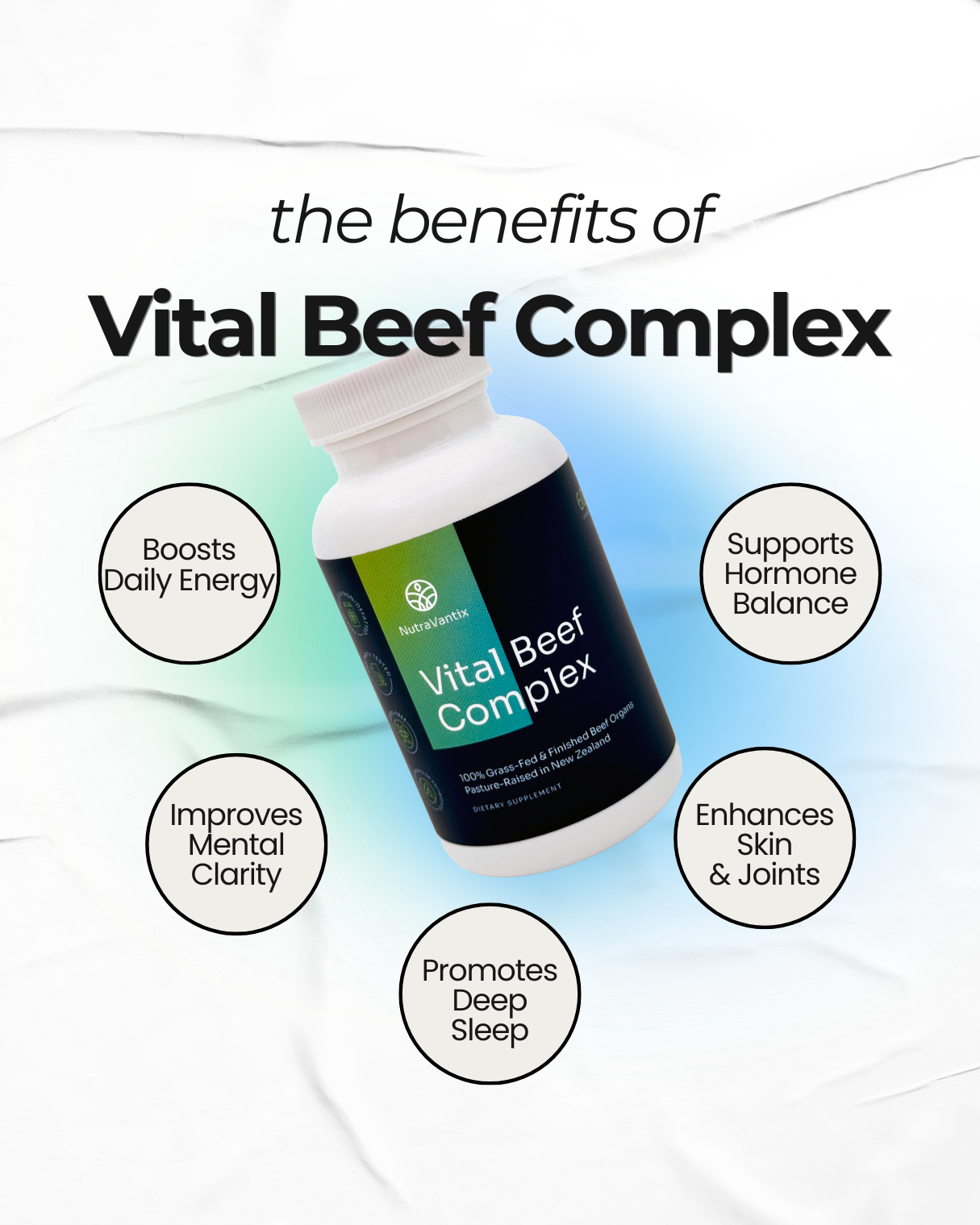 Vital Beef Complex delivers real ancestral nutrition your body recognizes and absorbs, restoring natural energy, clarity, balance, and recovery in a way synthetic supplements simply cannot match.